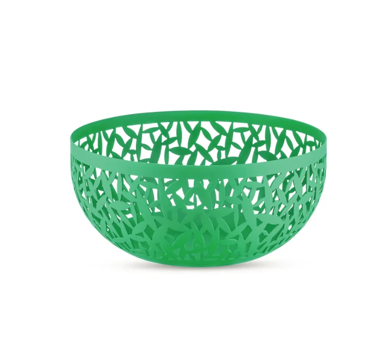 De ronde Cactus! fruitmand van Alessi is gemaakt van roestvrij staal en heeft een diameter van 21 cm met een hoogte van 9,5 cm. De groene schaal is voorzien van een epoxielaag en ontworpen door Marta Sansoni.