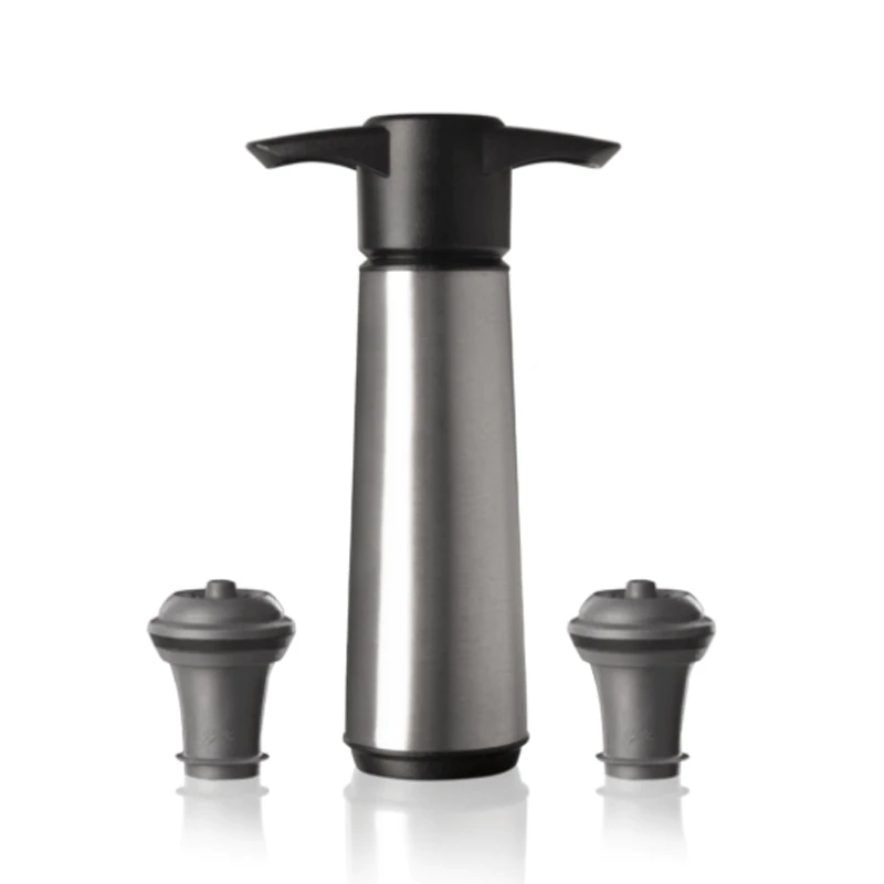 De Vacu Vin wijnpompset bestaat uit een rvs look wijnpomp en 2 stoppen. Dankzij een ergonomische greep ligt de pomp prettig in de hand. Met deze set wordt de fles wijn niet alleen luchtdicht afgesloten, maar is ook alle lucht uit de fles weggepompt, wat het oxidatieprocess vertraagt. Een geopende fles wijn is hiermee tot wel 10 dagen na openen nog prima geschikt om te drinken.